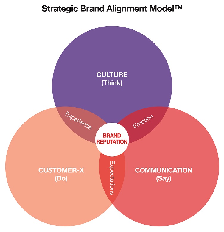 The Strategic Brand Alignment Method™ shown in the below model provides an approach for aligning organisational thinking, saying and doing by integrating the three brand-defining dimensions of corporate culture, communications and customer experience.