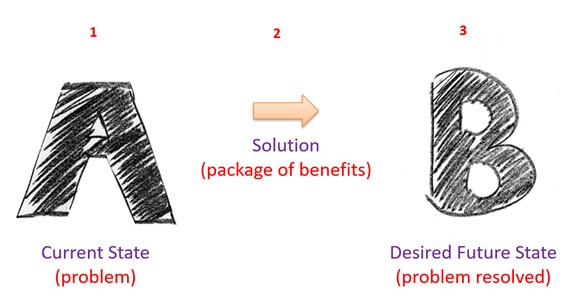 To articulate the true value of the solution you provide, you must articulate how your product/service closes the gap between the customer’s current state and desired future state – that is, how it takes them from A to B.