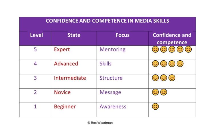 A person’s effectiveness as a media spokesperson is influenced by many variables, such as their personality attributes, knowledge, skillset and firsthand experience. The Media Spokesperson Confidence and Competence Scale™ shows the indicative journey from being a complete beginner, with low confidence and competence, to becoming an expert media spokesperson across different contexts and situations.